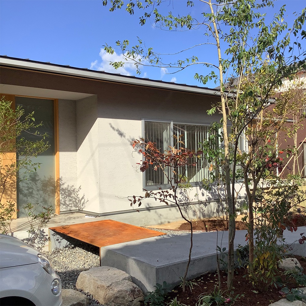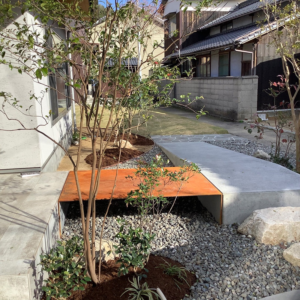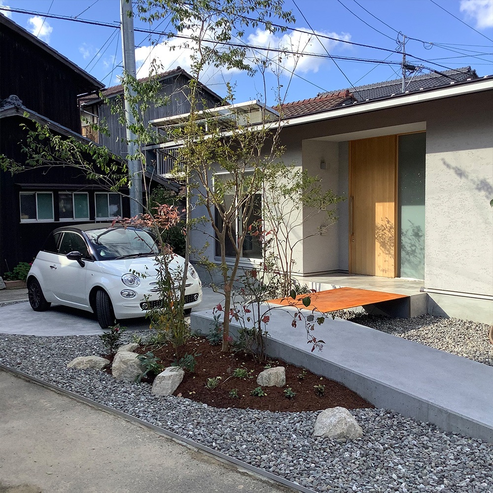 K様邸(愛媛県今治市) 投稿者: D1-fujii 2022年1月31日2022年1月31日 錆びた鉄板の橋の下には川をイメージした砂利を敷き、樹木は自然樹形の山採りの木。 味気なくなりがちなスロープとは異なり、そこには里山のぬくもりと安心感が生まれます。
