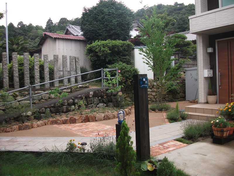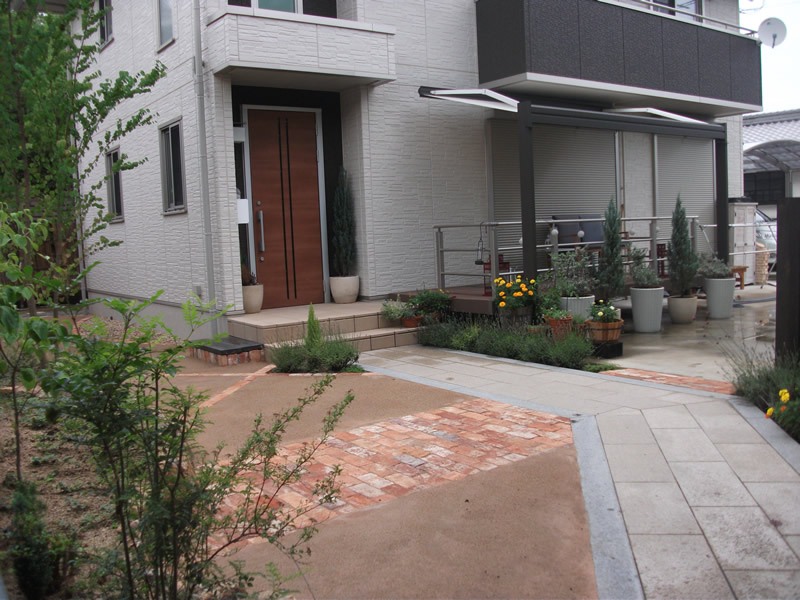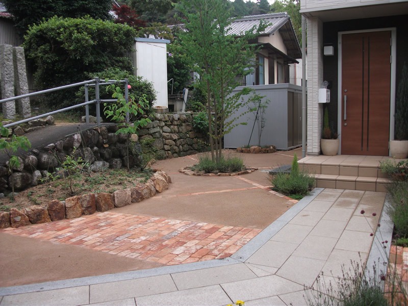 土の部分は真砂土のような舗装材で雑草が生えにくくなりました。アプローチに明るい色のレンガを用い見た目の印象も明るくなりました。